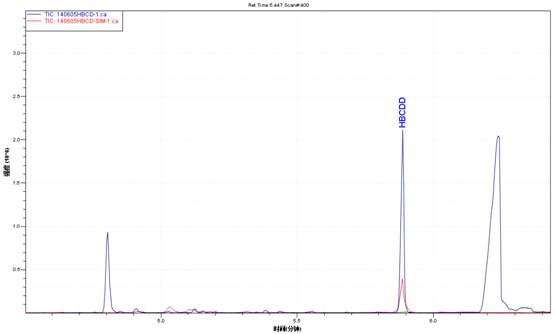 樣品TIC圖(藍(lán)色)與六溴環(huán)十二烷標(biāo)準(zhǔn)品TIC圖(紅色)