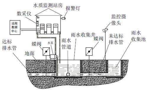 監測系統控制采樣單元將水樣導入監測室,并啟動監測水質的COD、pH、電導率等常規參數。達標雨水通過電控閥門排入市政雨水管網,一旦超標電控閥門關閉,禁止雨水排入市政雨水管網,并通過水泵將超標雨水泵入企業污水處理系統處理,達標后排放至市政污水管網。同時所有監測數據經由數據采集單元將數據統計后,由傳輸設備傳輸至企業監測中心或環保局,由此完成對雨水排放自動、實時、連續監控。