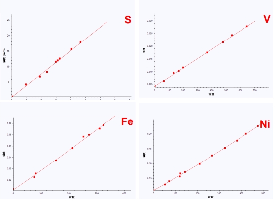 上圖為使用EDX 6000C能量色散熒光光譜儀測量不同含量石油焦二次標樣,建立S、V、Fe、Ni元素含量與強度的一次或二次校正工作曲線。由圖可知,S、V、Fe、Ni組分含量與強度具有非常好的線性關系。