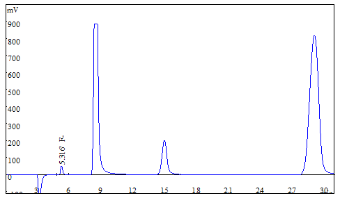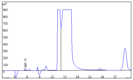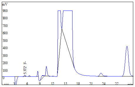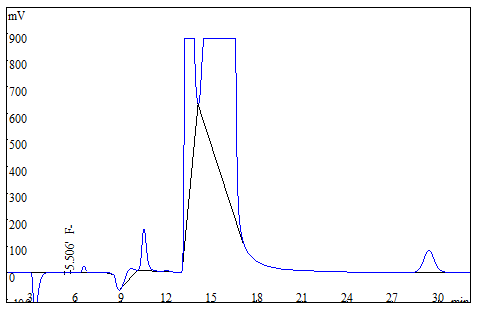 將大米、茶葉試樣分別粉粹后過篩,各稱取0.25g(精確至0.0001g),于氧彈燃燒儀進(jìn)行燃燒,冷卻后定容,經(jīng)0.22μm的水系濾膜過濾后上機(jī)得到樣品譜圖,如下圖3、圖4所示;食用油樣品直接稱重后進(jìn)行氧彈燃燒,測(cè)試得到的譜圖如圖5所示;生活飲用水直接上機(jī)后得到樣品譜圖詳見圖6。其中大米、茶葉、食用油中氟離子的測(cè)定結(jié)果均低于方法檢出限,同時(shí)對(duì)4種試樣進(jìn)行了加標(biāo)處理,加標(biāo)回收率在95.6%~102.3%之間。測(cè)試數(shù)據(jù)詳見表2。