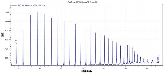 土壤和沉積物中的石油烴(C10-C40),經提取、凈化、濃縮、定容后,用帶氫火焰離子化檢測器(FID)的氣相色譜儀檢測,根據保留時間窗定性,外標法定量。根據石油烴(C10-C40)保留時間窗對目標化合物進行定性,即從正癸烷(包含)出峰開始時開始,到正四十烷(包含)出峰結束時進行積分,計算石油烴(C10-C40)的總峰面積。
